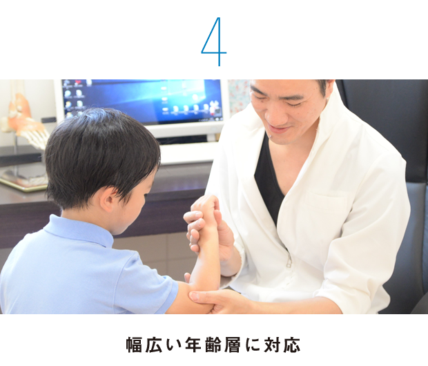 幼児からご年配の方、アスリートまで幅広い年齢層の様々な症状に対応可能です。豊富な臨床経験をもとに、一人ひとりの状態に合った最適な施術を行います。